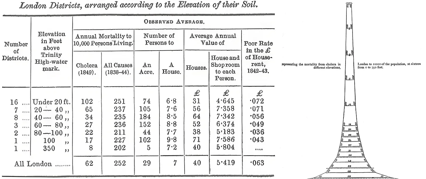 Consider medicine before germ theory. In the mid-nineteenth century, doctors thought that illness was caused by noxious air, and kept meticulous records accordingly. The physician William Farr mapped cholera deaths across London and found they correlated strongly with low elevation, which he thought was because noxious vapors accumulated in low-lying areas. He was actually picking up a real signal: low-lying districts were closer to the contaminated Thames River. But because his data was organized around air quality, he could not find the true cause.