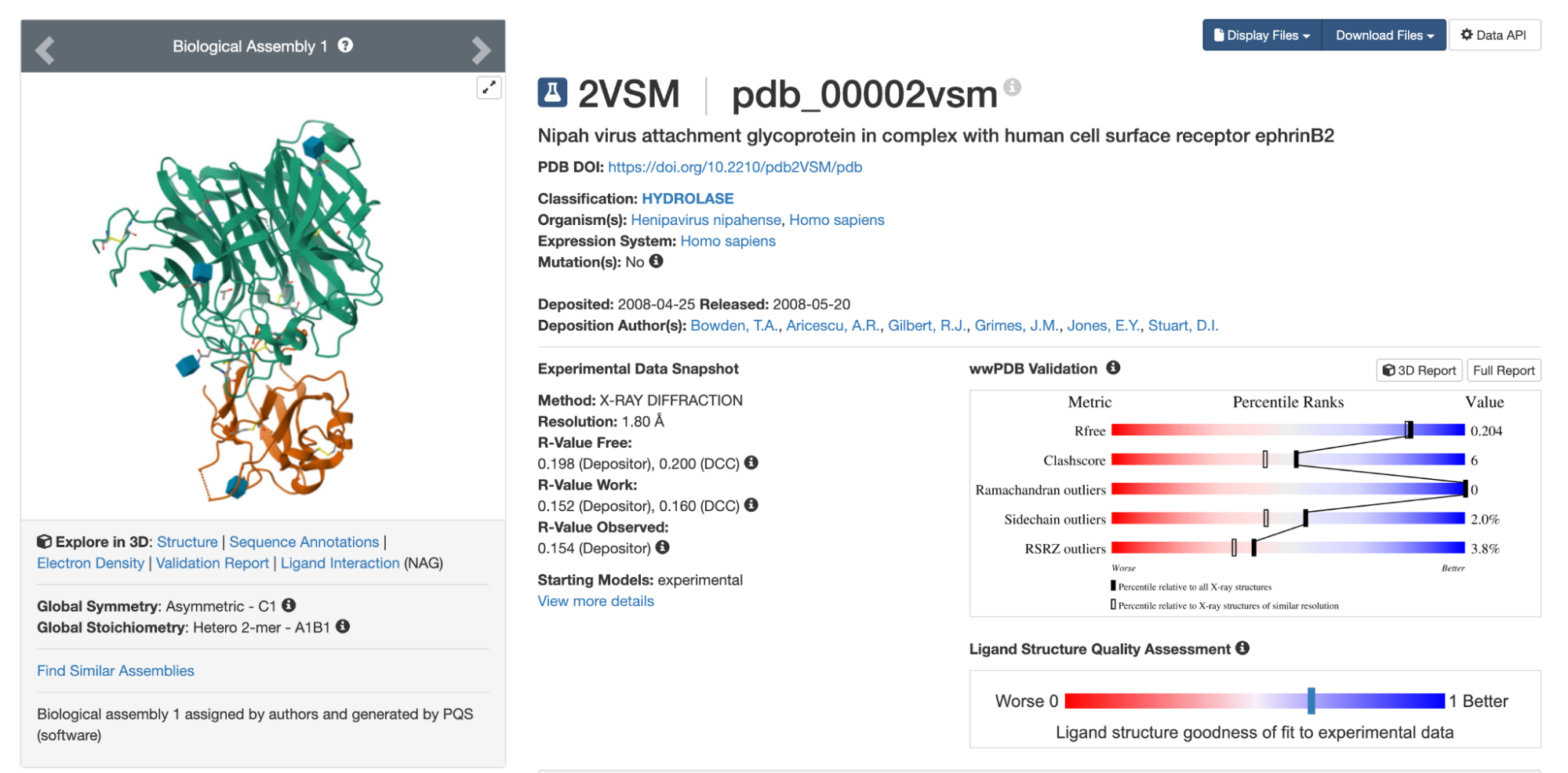 Looking at the UniProt list, 2VSM seems like a reasonable choice of target. It has the highest resolution of the available options, at 1.8 Å, slightly longer than a carbon-carbon bond. (Anything below 2 Å is considered high resolution for X-ray crystal structures.) The 2VSM structure also includes the virus’s natural receptor, Ephrin-B2, which shows exactly where on the surface a binder might attach.
