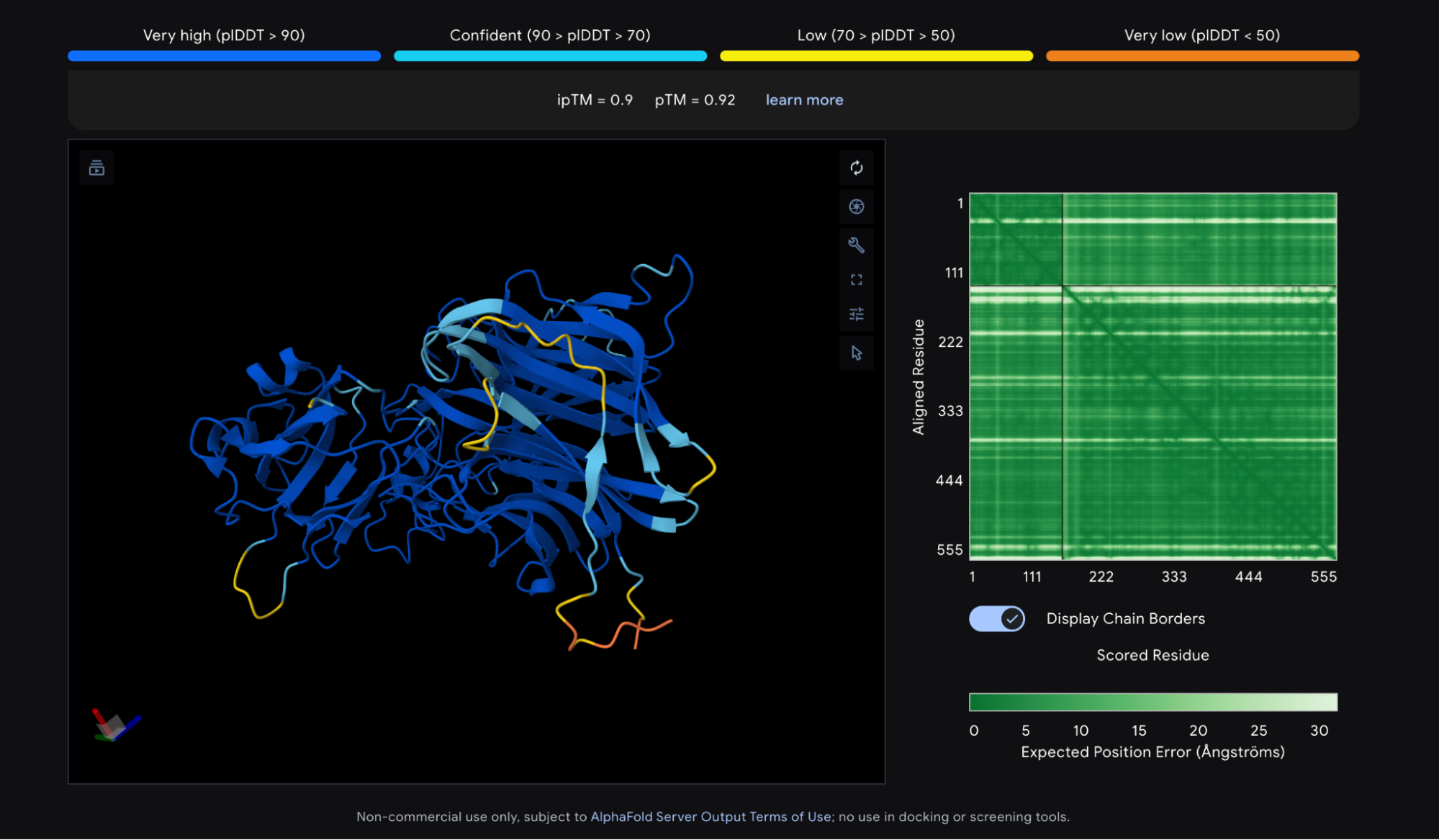 The AlphaFold 3 prediction for Nipah G bound to Ephrin-B2 looks good. Most of the structure shows a pLDDT above 90, the threshold for high confidence, and the ipTM is 0.9, meaning the model is confident about how Ephrin-B2 sits against Nipah G. The N and C termini score lower, but that is normal — those regions are disordered by nature. As a rule of thumb, a pLDDT above 90 and an ipTM above 0.8 are both good signs. This structure meets both of those cutoffs.