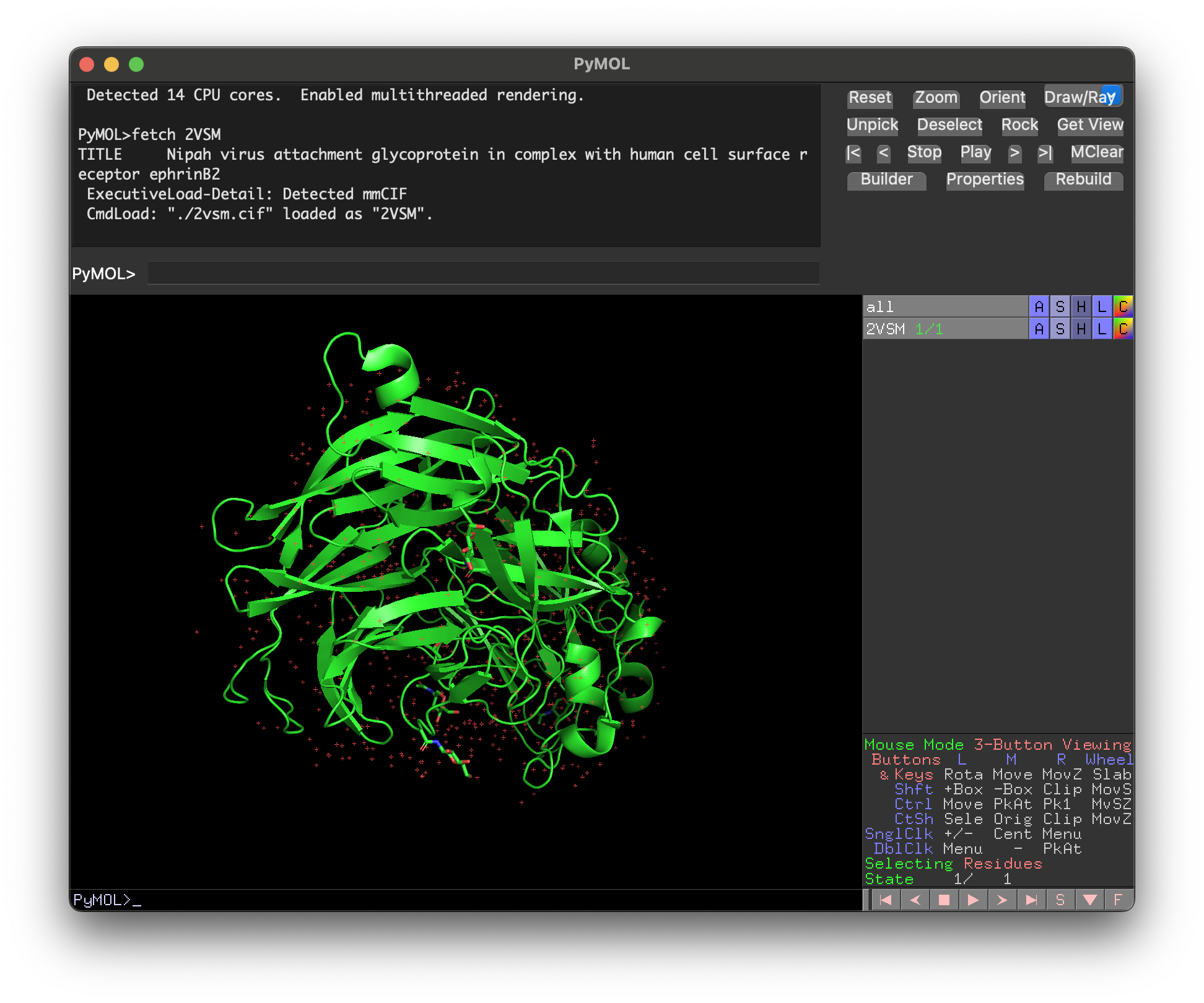 - First, load the 2VSM.cif file into PyMOL by typing