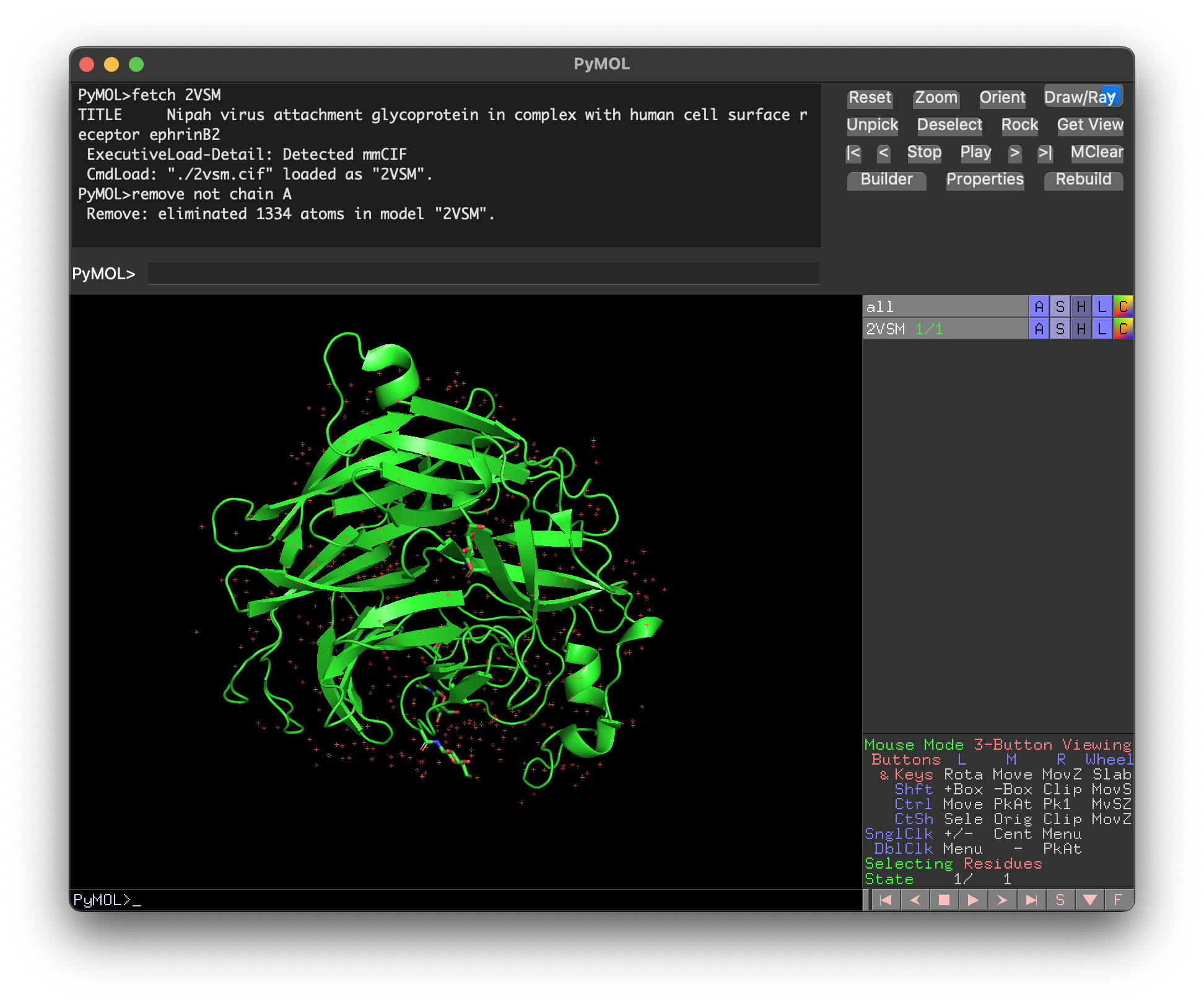 remove not chain A. To also show the protein sequence, typeset seq_view, on. The red dots on the screen are mostly water atoms, which can be removed with the commandremove hetatm.