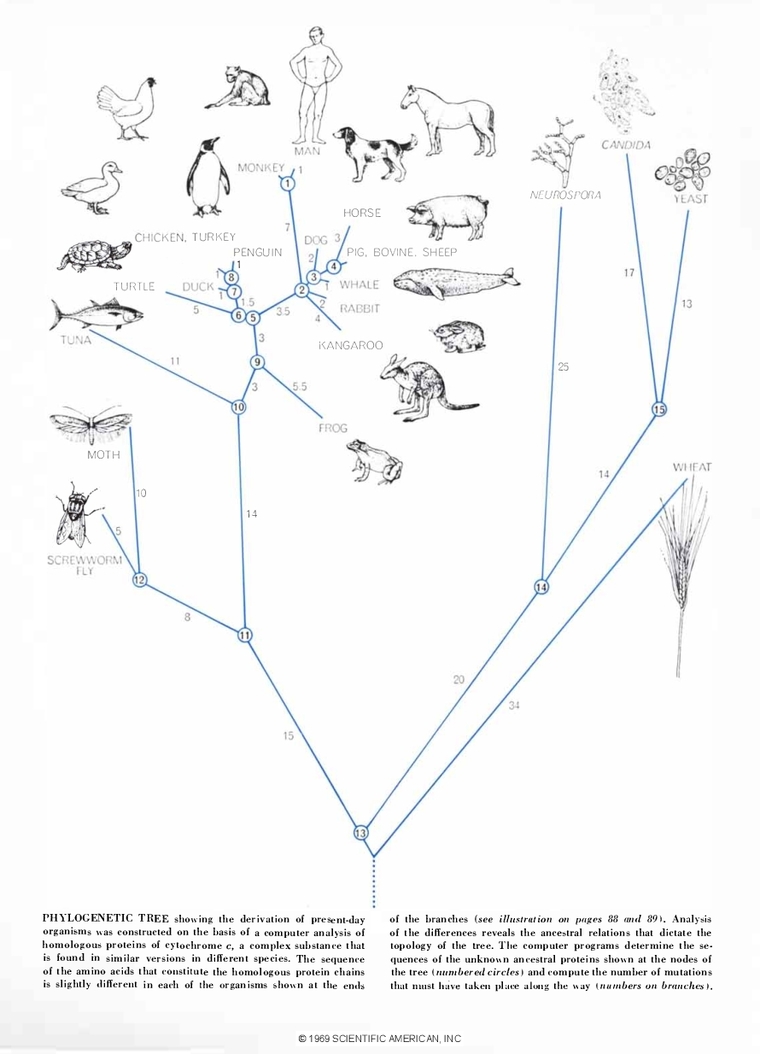 These protein sequences allowed scientists to interrogate evolution and phylogeny like never before. While building phylogenetic trees, a branching graph that organizes creatures by how closely related they are, dates back to Charles Darwin himself, access to molecular data and computation allowed scientists to compare organisms based on sequence data rather than observation alone. The Atlas data led to the fundamental realization that sequence similarity was proportional to evolutionary relatedness: as organisms accrue mutations, they separate into distinct species. Closely related organisms will share more protein sequences, having had less time to drift apart from one another genetically.