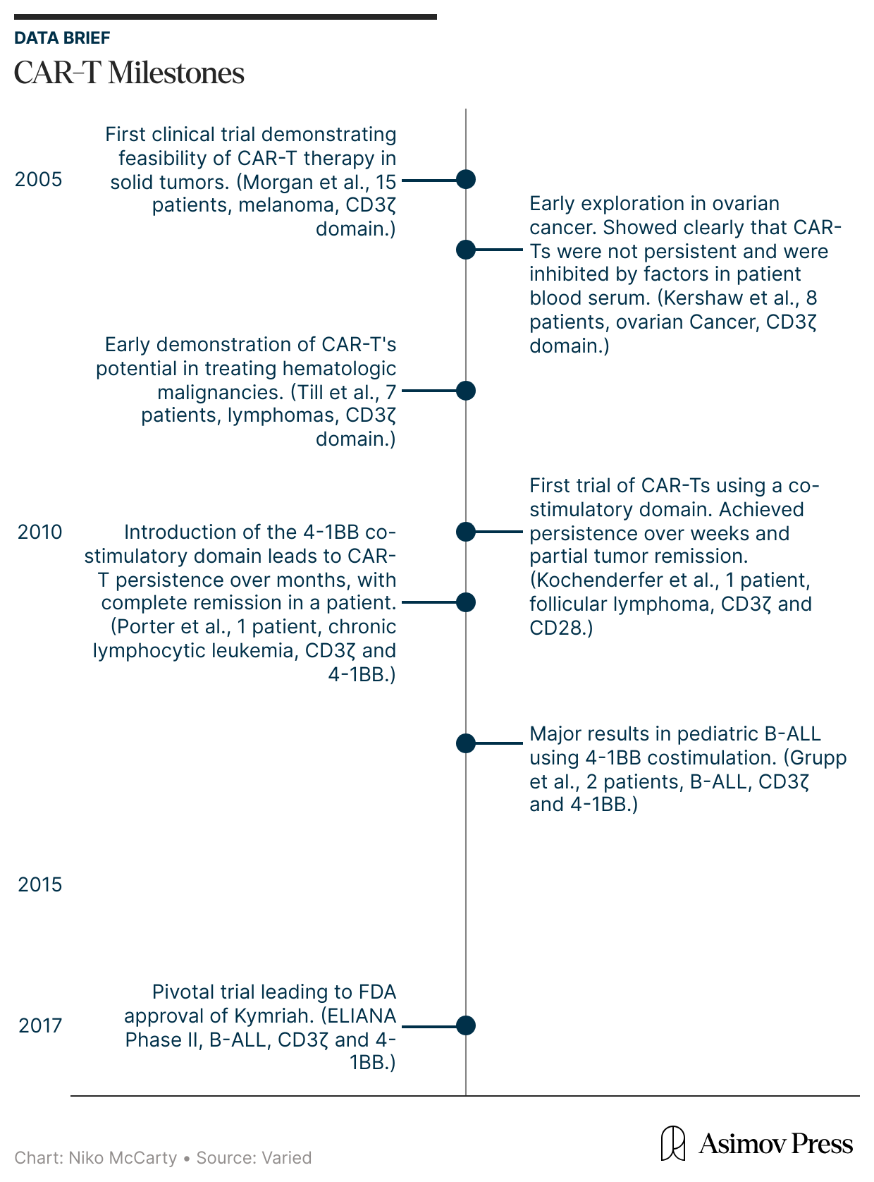 ELIANA was not a sudden breakthrough, though. It was, rather, the culmination of nearly two decades of clinical studies. During this period, CAR-T therapies evolved through repeated failure in the clinic, as careful studies of underwhelming results spurred new ideas to correct them. The ELIANA trial was led by investigators at the University of Pennsylvania, a group that had spent years studying CAR-T cells directly in patients well before regulatory approval.