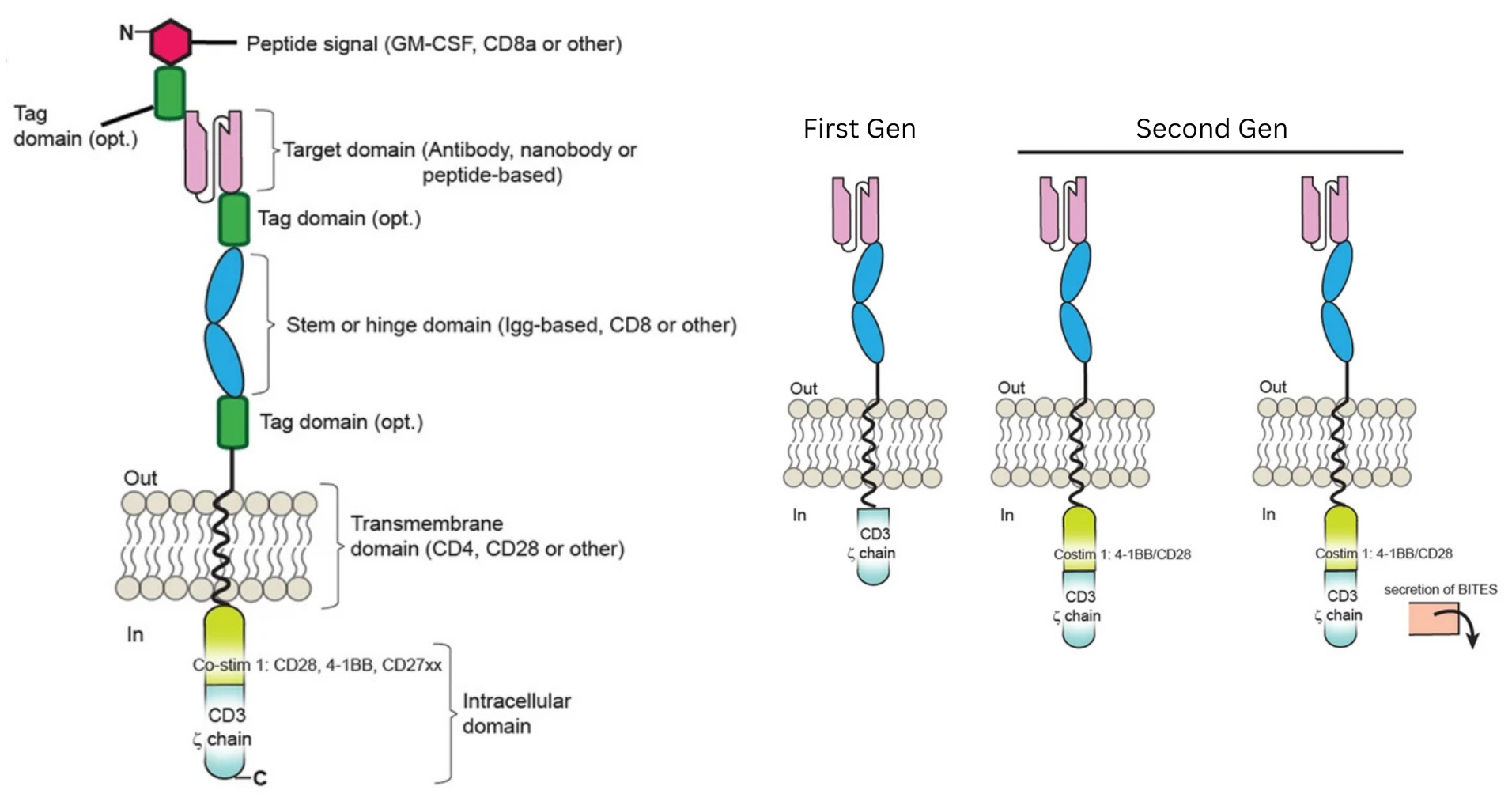 At this point, the diagnosis of why first-generation CAR-T therapies were failing matched long-standing insights from basic immunology. Decades of research had shown that T cells are not governed by a single on-off switch: signaling through CD3ζ provides only the first activation signal. To keep working, T cells need additional “costimulatory” signals,3 delivered through receptors such as CD28 or 4-1BB. First-generation CARs had been designed to deliver signal one without signal two, which explained their poor performance.