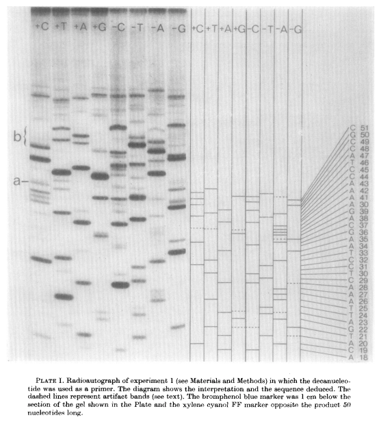 Although many scientists today assume that Sanger was the first to figure out how to sequence DNA, that’s not the case. As with RNA, Sanger was edged out by a Cornell biochemist. This time it was Ray Wu, who, in 1970, published a method to "read” specific sections of two bacterial virus genomes, called λ and bacteriophage 186. Wu’s method was only capable of sequencing “cohesive ends,” short single-stranded sections of these particular phage genomes, and so wasn’t considered a “general” solution to the DNA sequencing problem. In 1974, Wu’s lab refined this technique into the first general sequencing method, but it proved extremely labor-intensive and failed to catch on.
