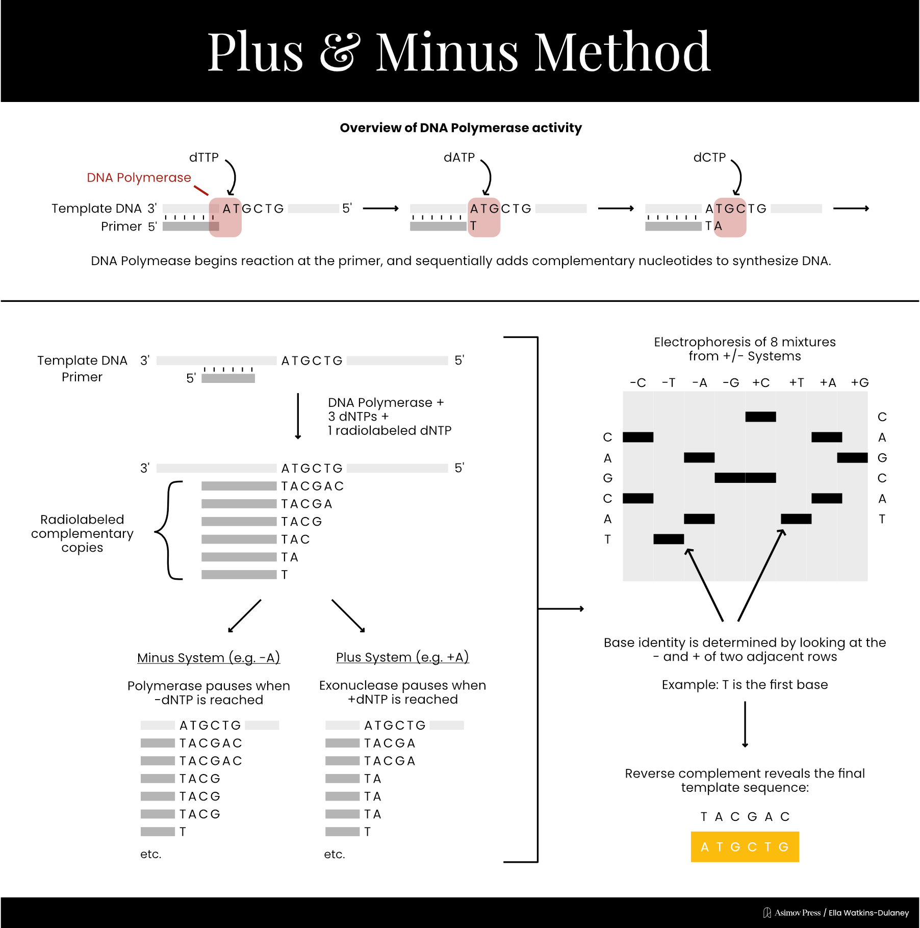This reaction would contain only low concentrations of the dNTPs and relied upon brief incubation times, so that DNA synthesis would stall at random positions along the template and yield a population of DNA fragments with varying lengths. These unfinished DNA fragments were then purified and used as templates in four “minus” and four “plus” reactions.