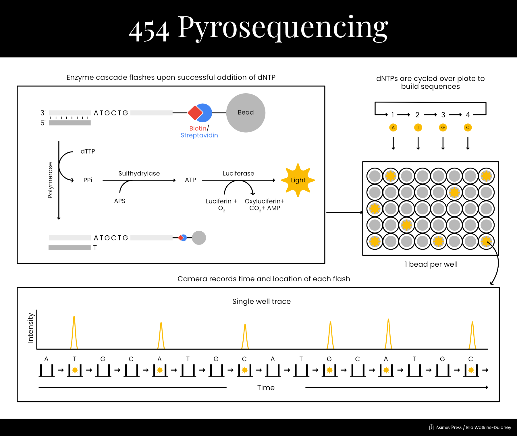 Funding limitations prevented Nyren from dedicating much time to the project at first, but in 1993, he was finally able to publish a proof-of-principle. His technique began by mixing the template DNA with a primer, a single dNTP, and three enzymes: the familiar DNA polymerase plus the light cascade enzymes, ATP sulfurylase and firefly luciferase.6 If the dNTP was incorporated into a strand of DNA, PPi would be produced in the chemical reaction. ATP sulfurylase could then convert the PPi into ATP, which would provide energy for the luciferase enzyme, producing light. Thus, it was possible to determine each base in the sequence by cycling through the dNTPs one at a time until light was detected, and then washing extra nucleotides out between each step. By literally rinsing and repeating, the sequence could be recorded one letter at a time without the use of any gels, which often took hours to run and were difficult to automate.
