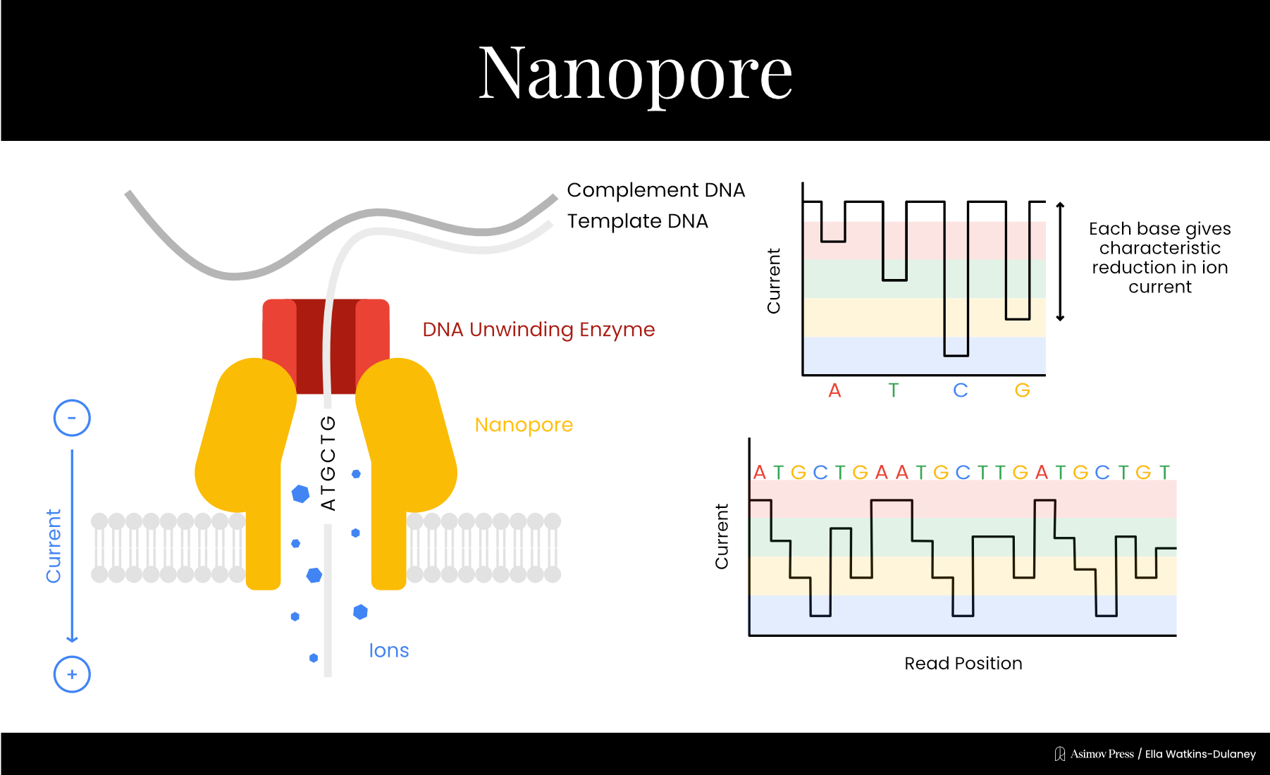 In 2001, Hagan Bayley’s lab at Texas A&M demonstrated a limited sequencing method based on the observation that correctly and incorrectly paired DNA bases disrupted nanopore current to different extents. They tethered a short piece of DNA with a few unknown bases to the entrance of the nanopore, then added other short DNA strands with different bases at the position corresponding to the unknown base on the tethered strand. By looking at which base produced the disruption corresponding to a perfect match, they could guess the unknown nucleotide.