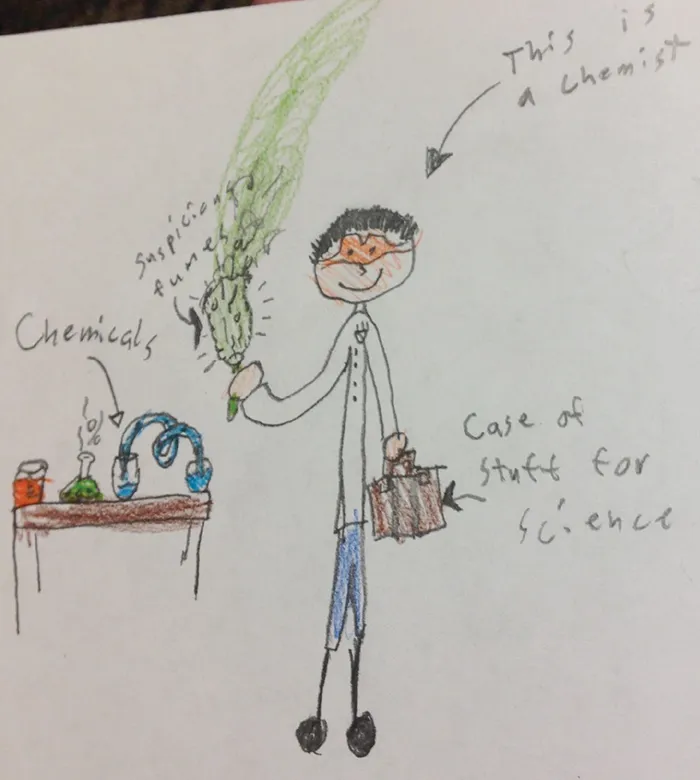 In the 1960s, David Chambers, a researcher at Deakin University in Australia, instructed teachers to give children a blank sheet of paper and ask them to draw a scientist. Chambers repeated this experiment many times over eleven years, collecting more than 4,800 drawings. The results were surprisingly consistent: white lab coat, glasses, beakers, mysterious machinery, someone saying “eureka!” The study has since been repeated dozens of times. While some details have changed, with beakers replaced by rockets, microscopes by vaccines, or men by women (sometimes), the scientist always wears a white lab coat.