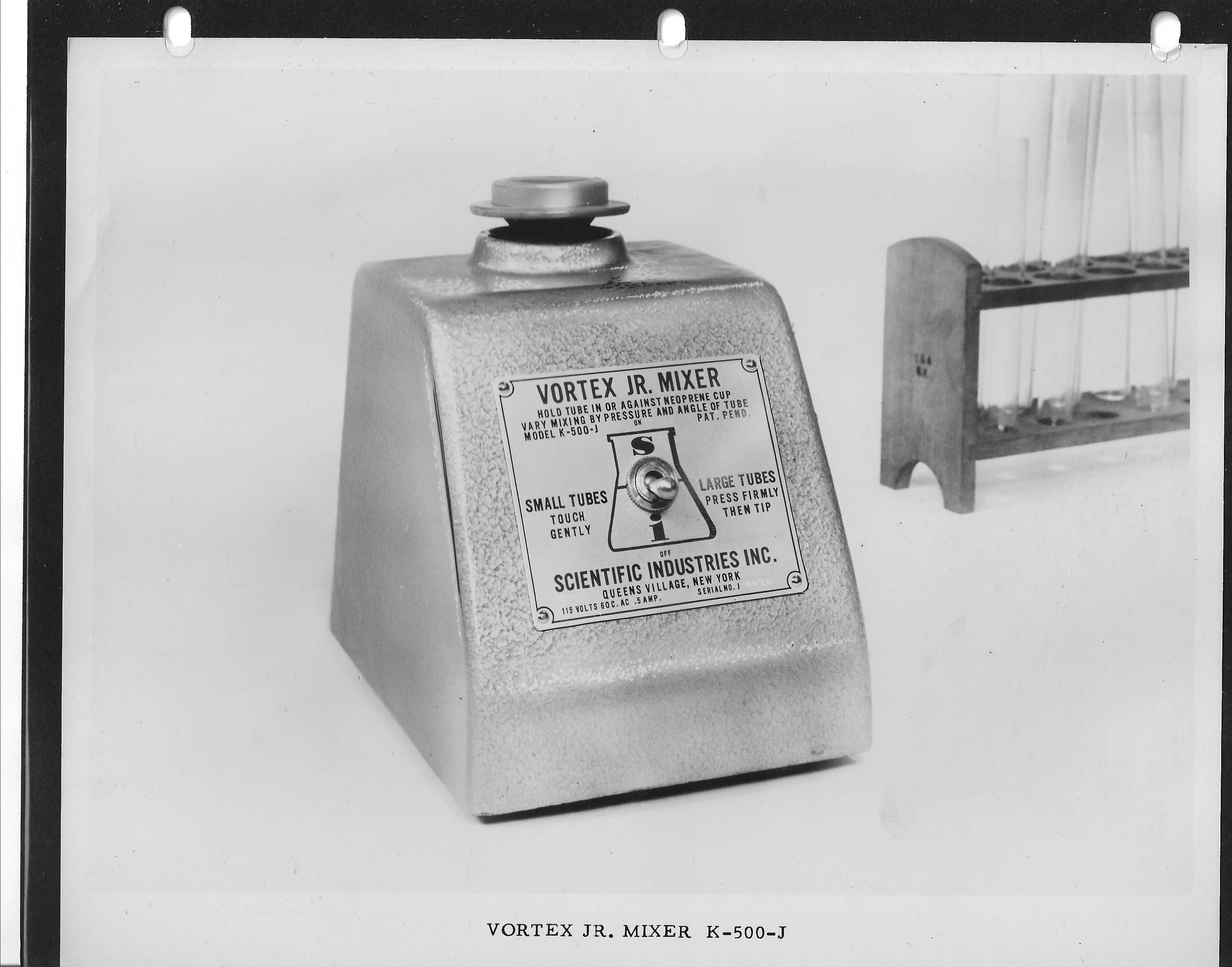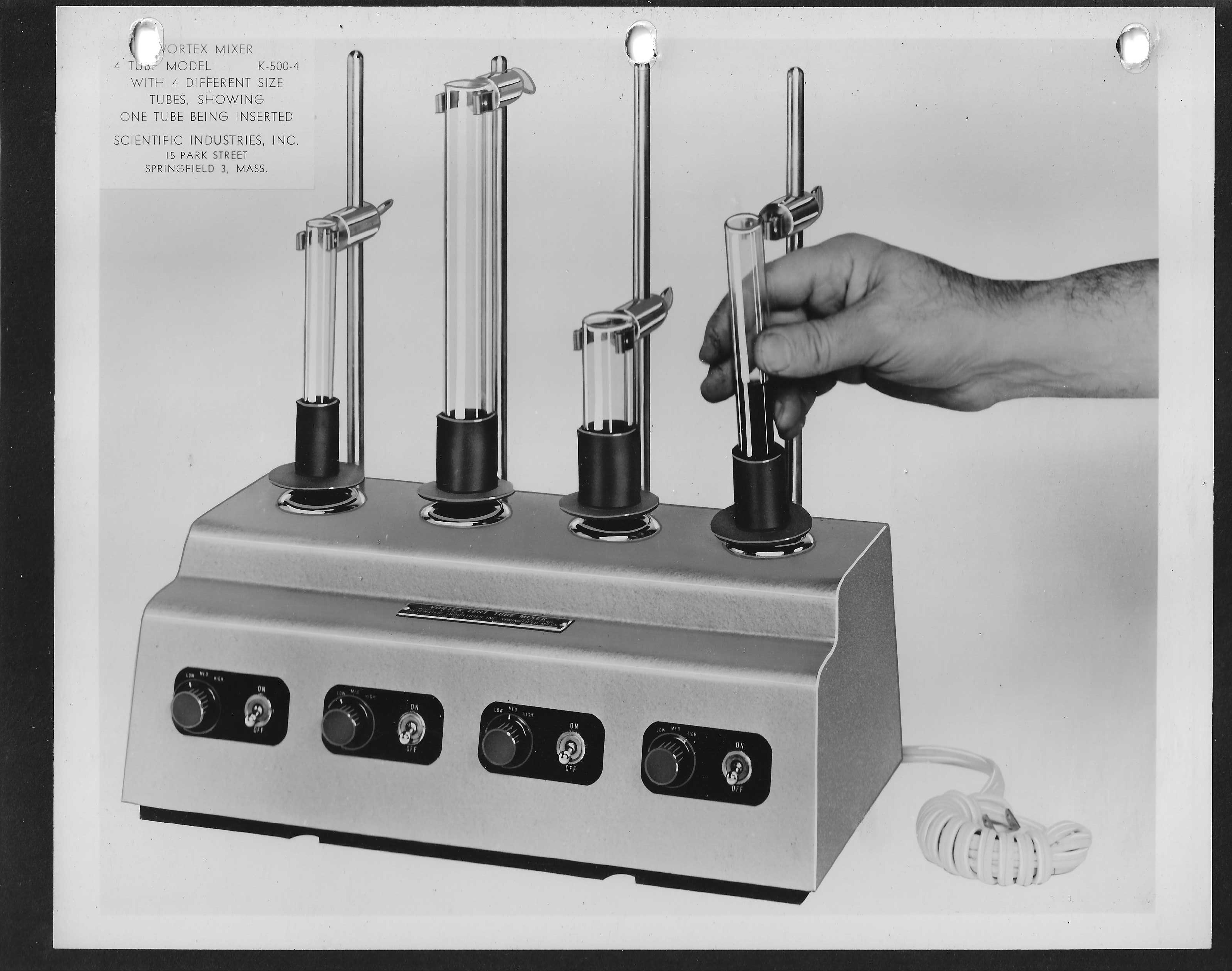 The patent, which Harold and Jack filed on April 6th, 1959, was granted on October 30, 1962. During this time, the brothers were not idle. They began to work with Scientific Industries Inc., a scientific equipment company established in Springfield, Massachusetts, in 1954. Harold became its president and Jack its treasurer, and the two moved the company to Queens Village, New York. Scientific Industries Inc. began manufacturing and selling the Kraft brothers’ vortexer in 1962. The very first model was named the Vortex Jr. Mixer. The company also experimented with other form factors and head attachments, like the K-500-4 model, able to mix four tubes simultaneously.